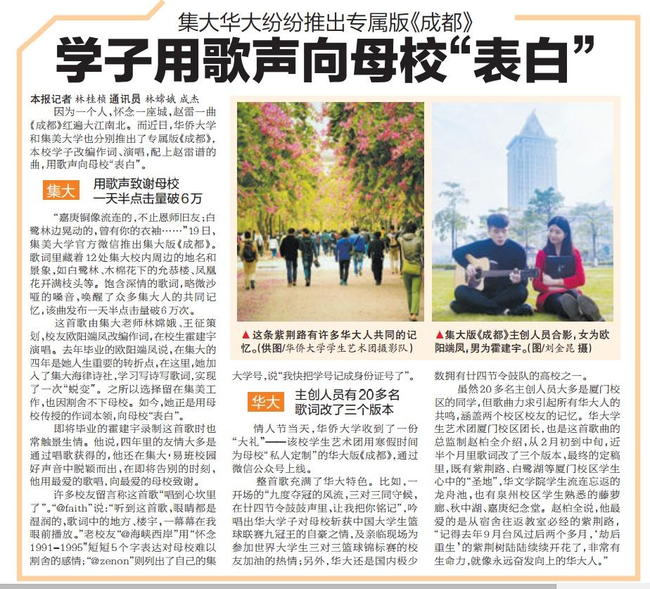 厦门日报:集大华大纷纷推出专属版《成都》 学子用歌声向母校“表白”