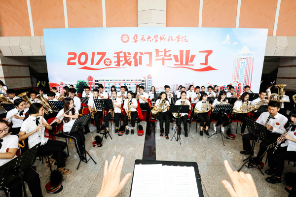 一支慷慨激昂的交响乐奏响了典礼的序曲,毕业生们纷纷在留言墙上签字、合影留念,播放的毕业视频勾起了大家对四年诚毅生活的温馨回忆。