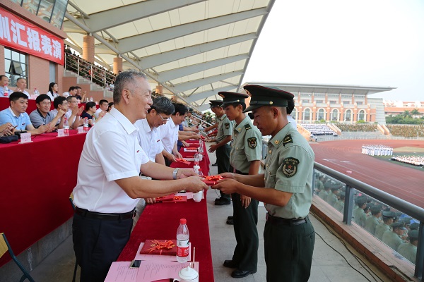 9月29日,我校于庄重文夫人体育中心举行2017级新生开学军训总结会暨军训汇报表演,2017级一万多名新同学参加了检阅。校领导李清彪、叶美萍、郑志谦、黄德棋、李克、曹敏杰,73051部队政治部主任韩波中校等参加了大会,大会由校党委常委、副校长黄德棋主持。