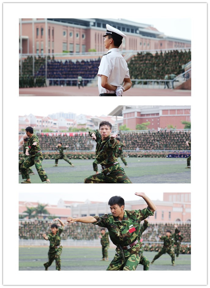 73051部队范翰翰少校主持分列式。来自各个学院的新生方阵以饱满的热情、整齐的步伐和豪迈的气魄展现了这场华丽的蜕变。诚毅学院960名新生组成创意方阵,体育学院、计算机工程学院、信息工程学院300名新生组成的匕首操方阵,航海学院与轮机工程学院360名新生的捕俘拳和综合拳表演等综合展示了我校此次军训的优秀成果。