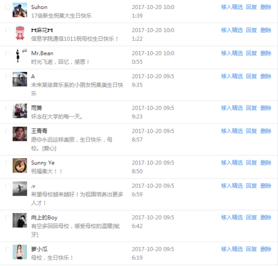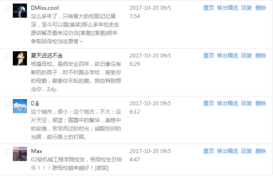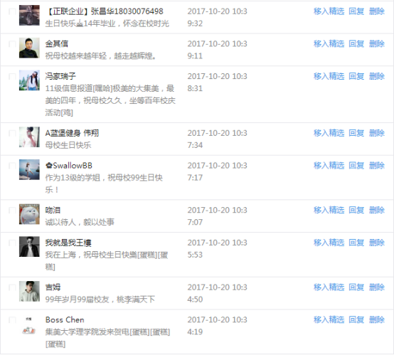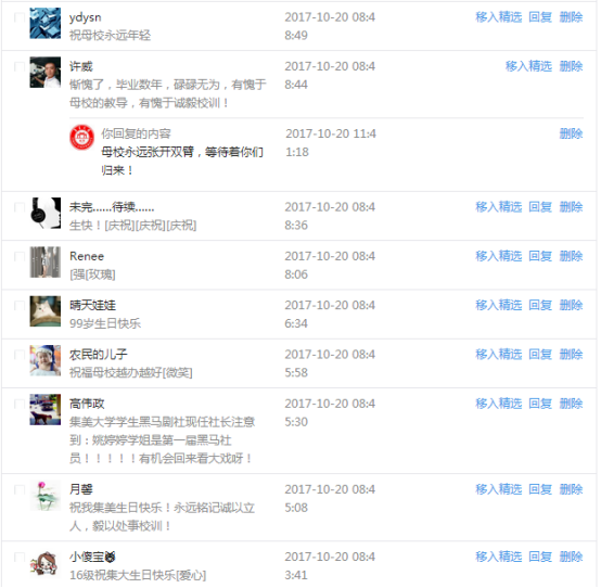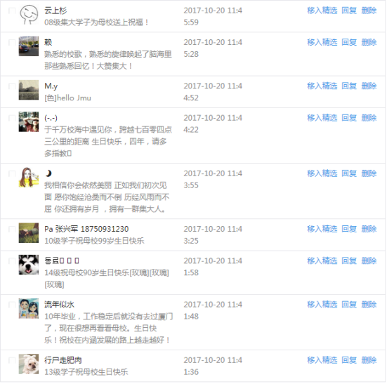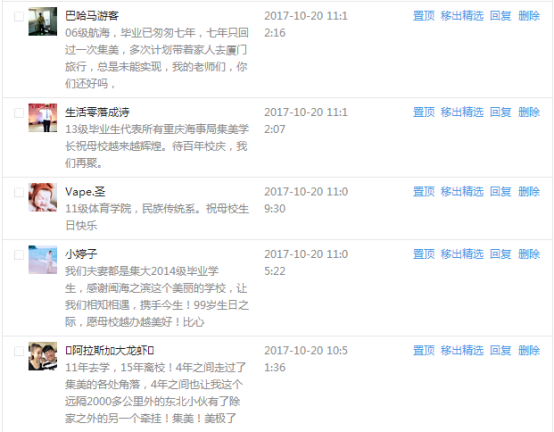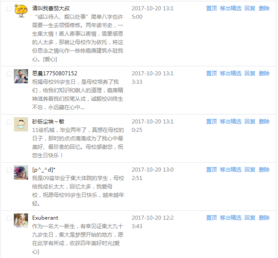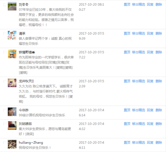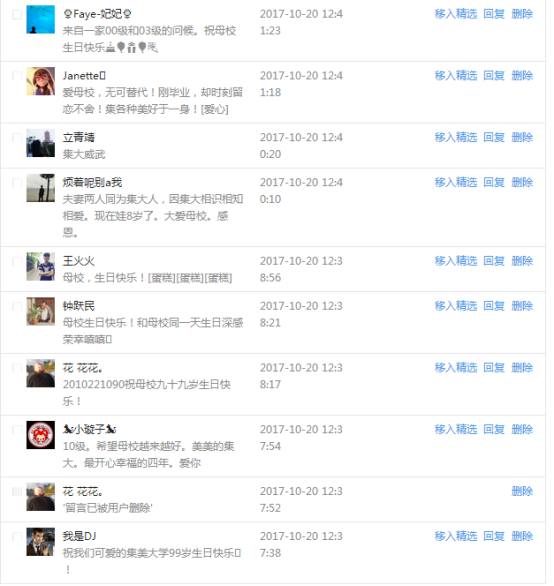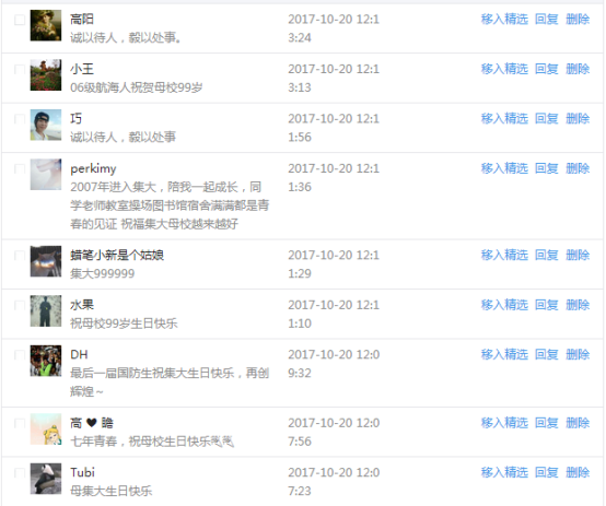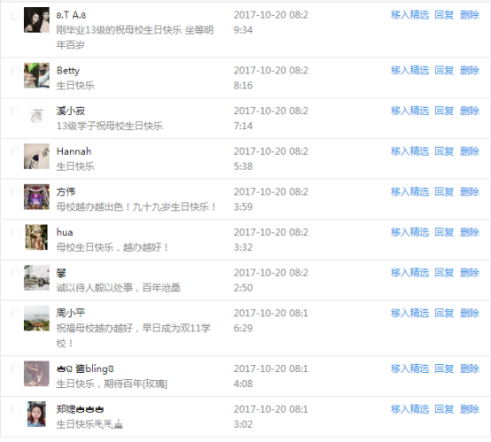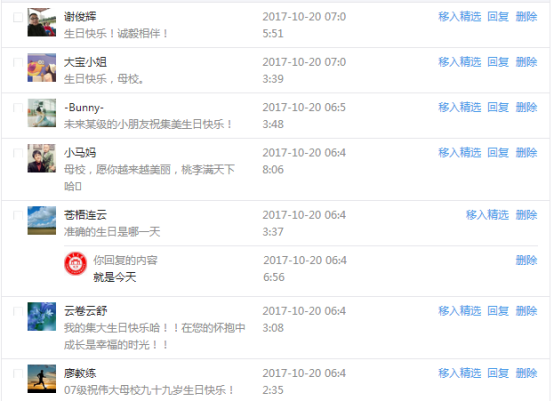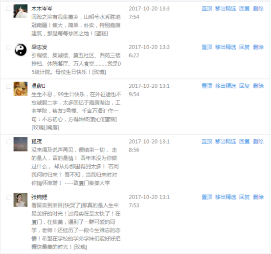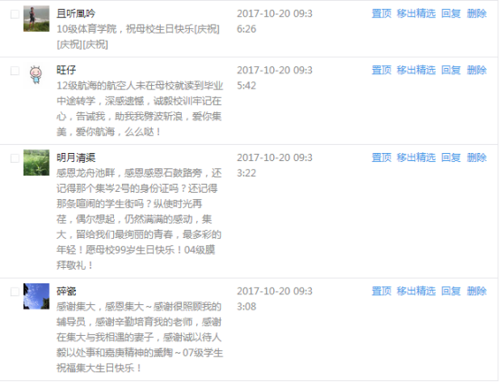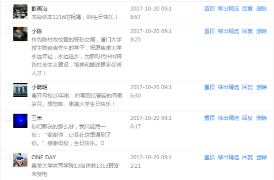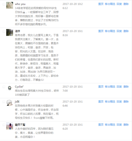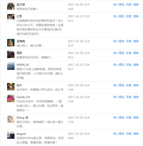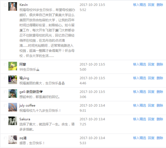 今天是我校建校99周年纪念日,学校官方微博、微信同步推送校庆日专题,得到了海内外各届校友的积极关注,校友纷纷为母校留言点赞,截至发稿时至,微博总浏览量4.9万,留言数76,点赞数222;微信推文总浏览量2.63万,H5祝福专题超过50万人次点赞祝福,微信后台留言数681,点赞数795。海内外校友在留言中表达了对在母校学习生活的时光的怀念,感谢母校的培育,祝福母校生日快乐!希望母校越办越好!
