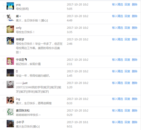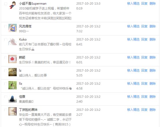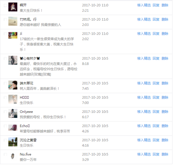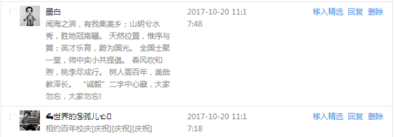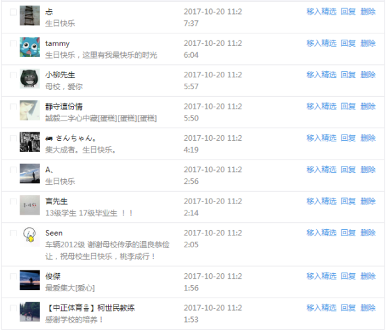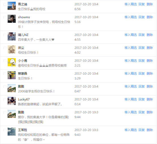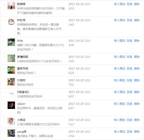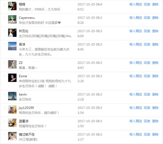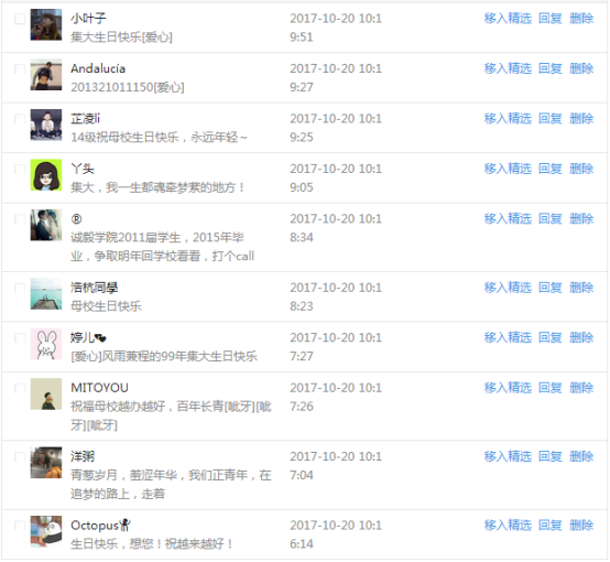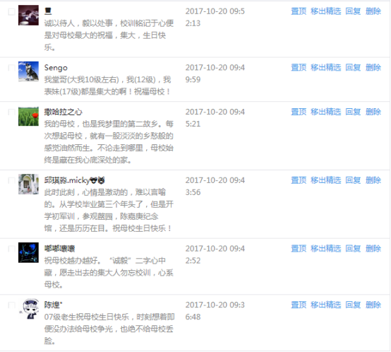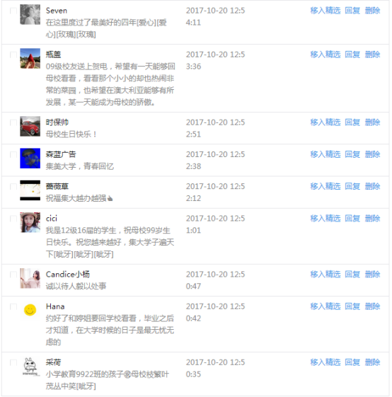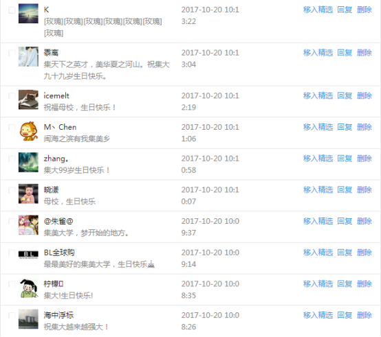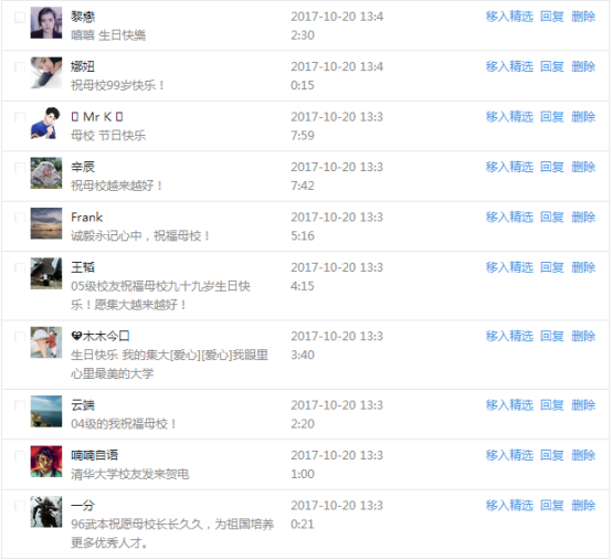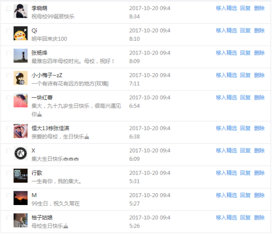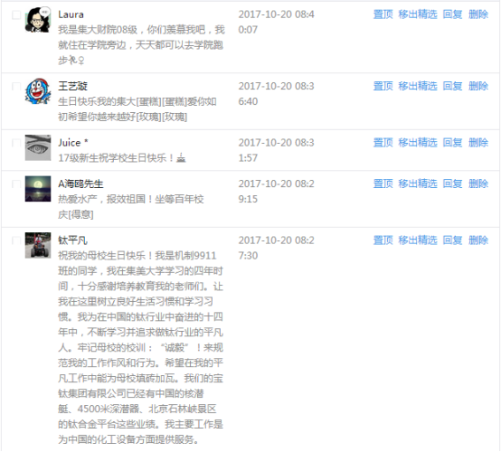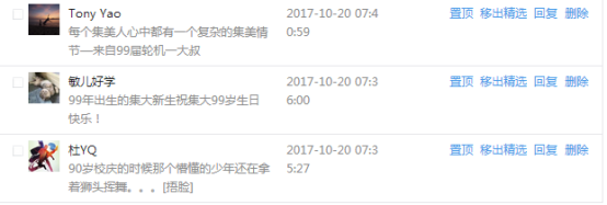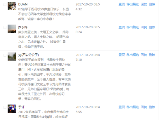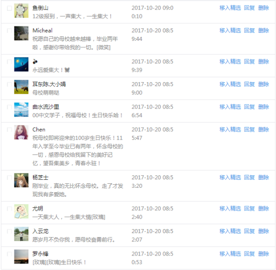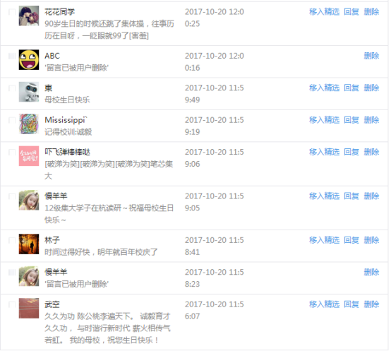 今天是我校建校99周年纪念日,学校官方微博、微信同步推送校庆日专题,得到了海内外各届校友的积极关注,校友纷纷为母校留言点赞,截至发稿时至,微博总浏览量4.9万,留言数76,点赞数222;微信推文总浏览量2.63万,H5祝福专题超过50万人次点赞祝福,微信后台留言数681,点赞数795。海内外校友在留言中表达了对在母校学习生活的时光的怀念,感谢母校的培育,祝福母校生日快乐!希望母校越办越好!