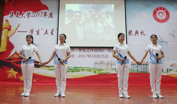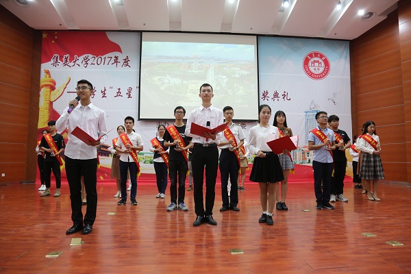 现场揭晓了“学习之星、科创之星、实践之星、志愿之星和自强之星”获奖名单。“学习之星”代表李嘉廉、“科创之星”代表齐锋同台用幽默生动的话语分享了他们学习、科创的心得。2017年学生最喜爱的教师、工商管理学院尤成德,水产学院辅导员张艳娇分别讲述了“实践之星”和“志愿之星”践行嘉庚精神和社会主义核心价值观的故事。“自强之星”代表梁昉炜分享了他自强自立的奋斗经历。最后,颁奖典礼在《集大抒怀——喜庆党的十九大》朗诵中落下帷幕,集大学子庄严地宣誓:将肩负起责任,奋力拼搏,再辟鸿蒙,续写集大新辉煌。