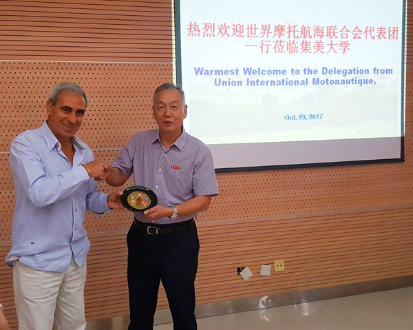 10月29日上午,世界摩托航海联合会(UIM)主席拉菲尔·丘里、办公室主任李卡多·拉贡聂达、亚太官方总部筹备委员会主席卢山一行在厦门市委副秘书长吴伟平的陪同下来访我校,副校长黄德棋会见了拉菲尔·丘里一行。我校航海学院、轮机工程学院、学校办公室和国际合作交流处相关人员参加了会谈。