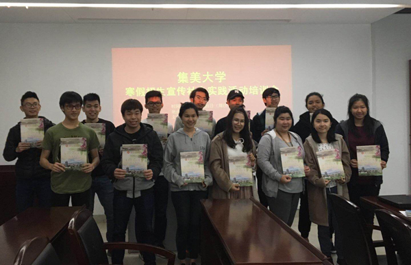 培训会上,我校招生办介绍了校主陈嘉庚先生爱国爱乡、倾资兴学、面向海外广纳侨生的历史,及此次寒假招生宣传社会实践活动的意义、具体工作要求和国际学生招生政策,并对国际学生进行了安全教育;详细解释了他们关注的留学集大申请资料的准备和福建省政府奖学金、厦门市陈嘉庚奖学金和我校国际学生奖学金的申请条件。