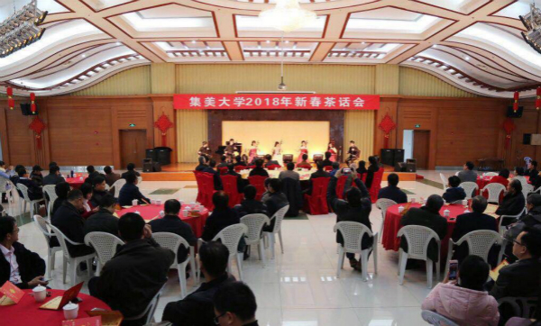 校党委书记辜芳昭在茶话会上致辞。他代表学校党政领导,向全校师生、长期关心学校的离退休老同志致以新春的祝福。他说,2017年是继往开来、承前启后的一年,十九大的胜利召开,向全党全国人民发出了迈向新时代的号令。这一年,我们认真学习贯彻习近平新时代中国特色社会主义思想和十九大精神,将党建和思政工作的优势转化为学校发展动力,有力保障了学校事业的进步。这一年,我们致力提高教学质量,人才培养水平不断提高。这一年,我们致力提高核心竞争力,继续加快内涵发展步伐,携手共进,共同建设美好的集大。在新的一年里,我们将以十九大精神为指引,共同迎接属于我们集大的新时代。