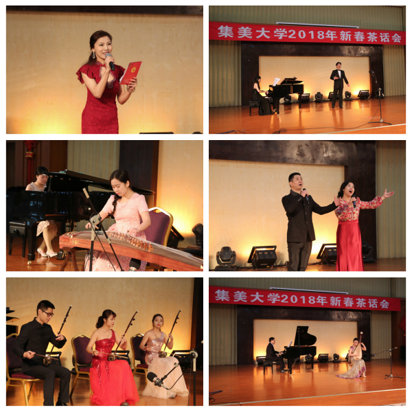 茶话会和乐融融,春意盎然。我校音乐学院的师生们表演了二胡齐奏《赛马》、男声独唱《鳟鱼》、古筝与钢琴合奏《乡韵》、男女声对唱《海之恋》、琵琶协奏曲《春秋》,为大家献上了精彩的贺新春节目。