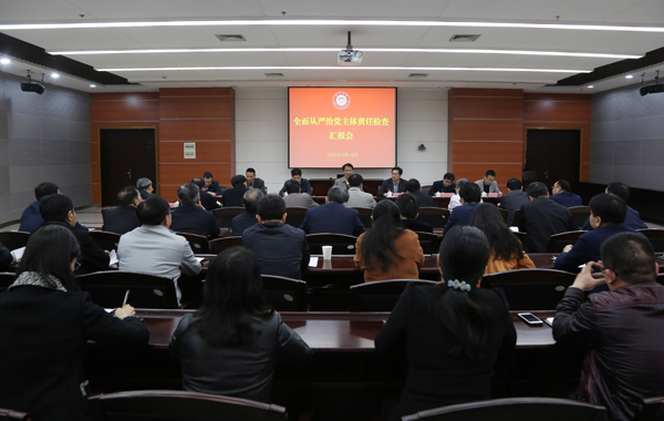 校党委书记辜芳昭围绕“学习贯彻党的十九大精神,强化主体责任,推动全面从严治党向纵深发展”这一主题,从加强党的政治建设、持之以恒正风肃纪、整治群众身边腐败和作风问题、意识形态主体责任落实等四个方面汇报了我校2017年度全面从严治党主体责任落实情况。校领导,校党委委员、纪委委员,主要职能部处和各学院党政主要负责人参加了汇报会。