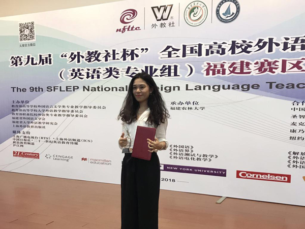 5月27日,由教育部高等学校外国语言文学类专业教学指导委员会、福建外国语文学会等主办,中国日报社·二十一世纪英语教育传媒合办的第九届“外教社杯”全国高校外语教学大赛(英语类专业组)福建赛区决赛在福建农林大学举行。我校诚毅学院人文科学系英语专业教研室教师杨琳、陈凤芳分别获得英语专业组特等奖和商务英语组三等奖,杨琳将代表福建省参加11月29日至12月3日在上海举行的全国决赛。