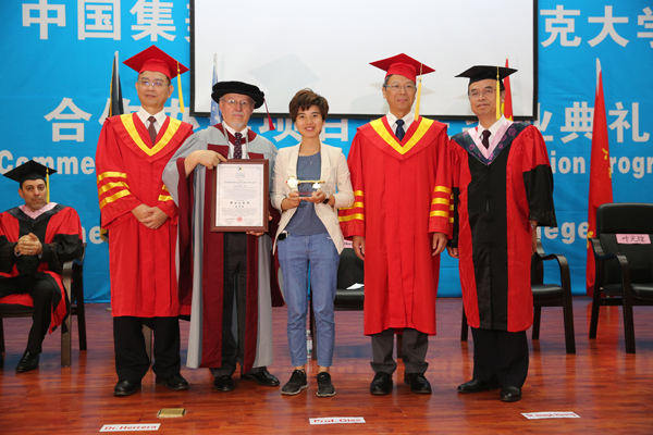 黄天中主持了2018届库克中国总校区学业总成绩状元和2018年库克中国杰出校友颁奖仪式。今年,海外教育学院学生章琳以优异的成绩获得了库克中国总校区学业总成绩状元,贺睿拉为她颁发了“金钥匙奖”。 “金钥匙奖”是库克大学为库克中国校区毕业生设立的,每届毕业生只评选一名,至今已评选了12名,其中我校共有9名学生获此殊荣。贺睿拉还为库克项目陈智雅、李思显和陈臻等三位杰出校友颁发了荣誉证书。颁奖仪式后,诚毅学院和海外教育学院相关领导分别回顾了该合作办学项目创立发展历程和所取得的显著成绩;三位杰出校友也分享了他们的奋斗故事,与毕业生共勉,为毕业生祝福。