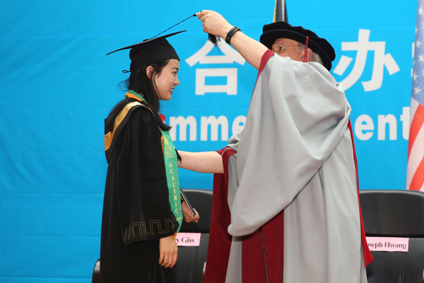 贺睿拉为全体毕业生颁发了库克大学学士学位证书,并一一为毕业生拨学士帽流苏,吉斯为获得学业成绩优秀奖的学生披上绿色绶带,黄磊康为获得生涯体验优秀奖的学生披上黄色绶带。每一位毕业生及其家长都走上主席台与台上领导合影留念。