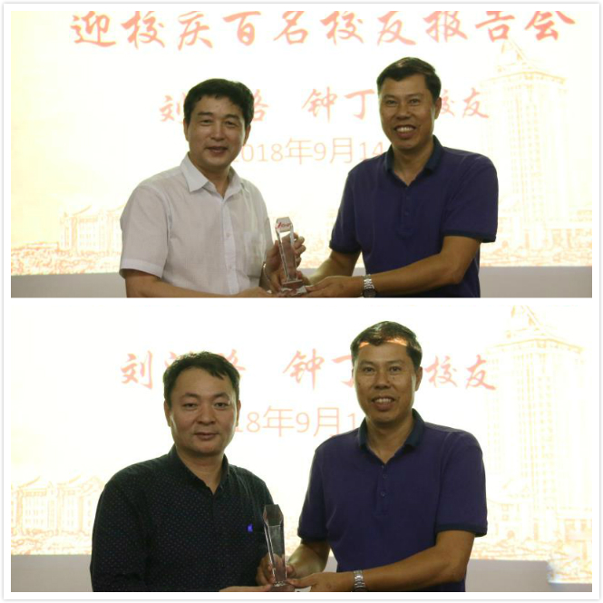 航海学院领导为刘洪路和钟丁牙两位校友颁发了迎校庆百名校友报告会主讲嘉宾牌匾,并对他们从百忙之中返校作报告表示感谢,希望航海学子们向两位优秀校友学习、做一名优秀的航海人。