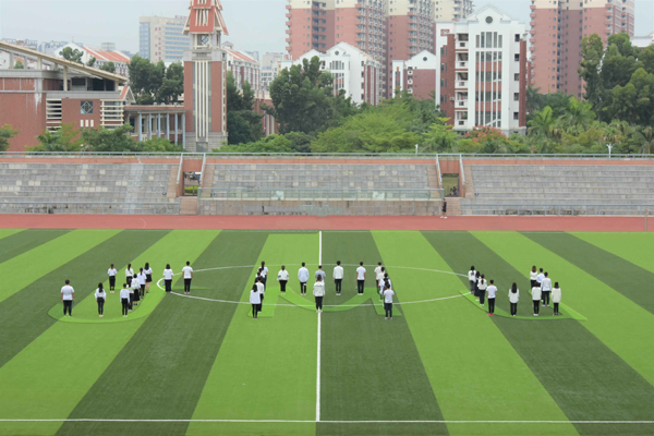 法学院50名学生在庄重文夫人体育中心组成方阵,依次变换序列,分别呈现出“JMU” “法” “100”等图案,绿色的草坪、红色的跑道与同学们身着的白色服装相得映彰,场面活泼生动。
