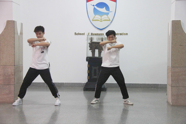 工商管理学院学子在学院大厅举行“祝福母校100岁生日快乐”创意活动秀,以精湛舞技为母校送上祝福。此次表演取材于校园生活的点点滴滴,以当红流行音乐为背景,以双人动作配合为主线,节奏轻快、造型活泼、动作铿锵,引得同学、校友驻足观看。