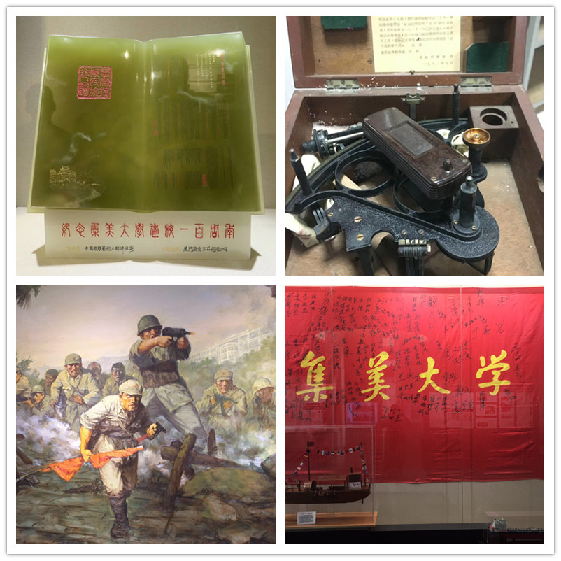 作为展现学校办学历史和办学成就的重要载体,校史馆充分展现出我校以国家富强、民族振兴为己任的百年办学光荣历程。除了图文并茂地呈现我校历史发展轨迹,丰富的实物展出也成为校史馆的一大亮点。首部玉石微雕作品《陈嘉庚语录》,留有中国首次北极科考队员签名的亚洲中文精品乱码校旗,1920年代的集美学校铜乐器,1921年集美学校创办的《集美周刊》,校友使用多年的测天工具六分仪,我校美术学院教师创作的、描绘校史重大事件的油画作品……参观者可以在承载了时光记忆的展品中感受到学校历史的真实与厚重。