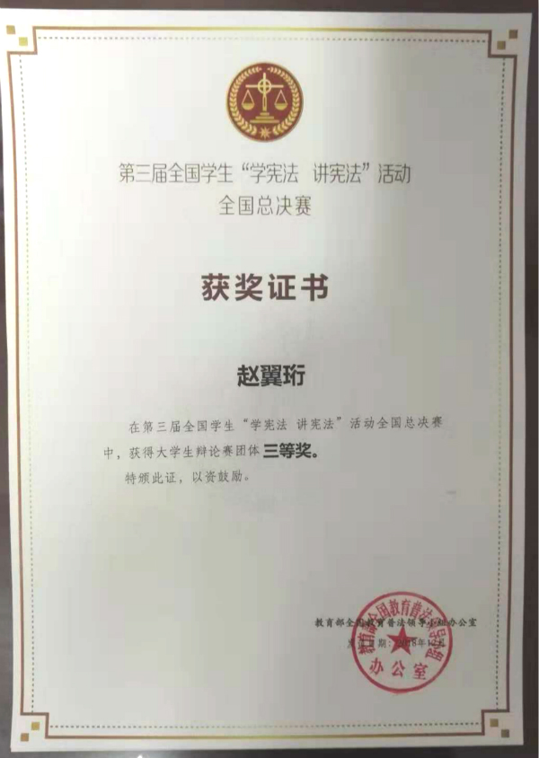 近日,第三届全国学生“学宪法 讲宪法”活动全国总决赛在北京举行。我校法学2016级学生赵翼珩与福州大学范佳星、福建师范大学肖罡晟及福建江夏学院李宁悦组成的福建省代表队参赛,凭借出色的表现获得大学生团体辩论赛三等奖