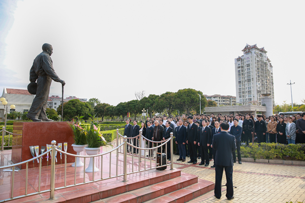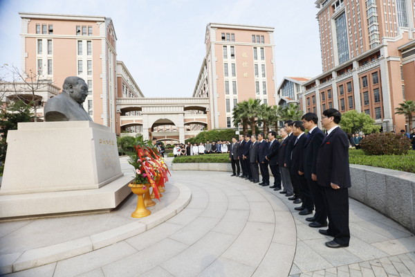 校领导、校友会和诚毅学院师生代表,分别向李尚大先生铜像和陈文确先生、陈六使先生铜像敬献花篮并三鞠躬,缅怀他们的丰功伟绩,表达对李尚大先生、陈文确先生、陈六使先生的崇高敬意和深切哀思。