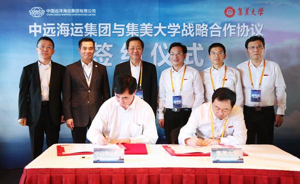 9月26日下午,我校与中国远洋海运集团在“鼓浪屿”号上举行了战略合作签约仪式。校党委书记沈灿煌、校长李清彪、副校长于洪亮,中远海运集团董事长、党组书记许立荣,中远海运集团副总经理黄小文出席签约仪式。学校办公室、发展规划处及相关学院负责人,中远海运集团办公厅、战企部、研咨中心及中远海运船员公司、中远海运(厦门)相关负责人参加仪式。