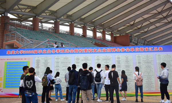 11月27日,我校2020届毕业生冬季双选会暨校董校友企业招聘会在庄重文夫人体育中心举行。厦门翔业集团、福信集团等校董校友企业,戴尔(中国)有限公司、新希望六和股份有限公司、福耀玻璃工业集团股份有限公司、中信证券股份有限公司福建分公司等来自省内外的400余家企事业单位参会,共为毕业生提供1万余个就业岗位,招聘需求覆盖我校所有专业,我校及周边院校7000余名毕业生参会。