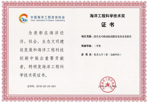11月30日,中国海洋工程咨询协会2018年度海洋工程科学技术奖颁奖大会在北京召开,十一届全国人大常委会副委员长周铁农、自然资源部总工程师张占海出席会议并为获奖代表颁奖。我校何宏舟教授领衔完成的项目“漂浮式可移动波浪能发电技术及装置”获二等奖。