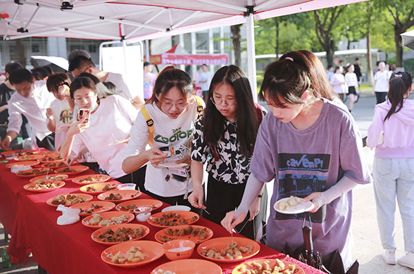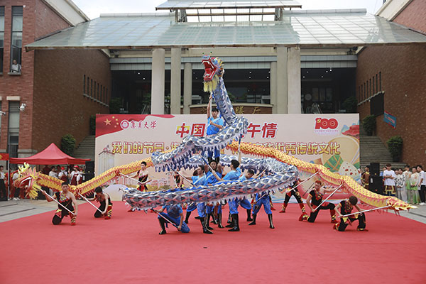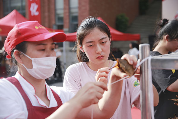 包粽子、品好菜、赏川剧、看武术……活动现场气氛热烈,学生热情高涨。学生参与度最高的要数包粽子比赛,吸引了全校48名学生报名参赛,其中8名为外国留学生。他们在食堂师傅的指导下一同感受包粽子的乐趣,其中一组4个人用8分钟包了42粒粽子,夺得冠军。来自马来西亚的留学生刘伟吉也参加了现场比赛,他说:“我的家乡也过端午节,虽然没办法回去,但我在学校跟同学们一起包粽子,就跟在家里一样温暖。”