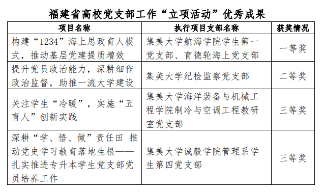 据悉,高校党支部工作“立项活动”和“三个好”成果评选是省委教育工委推动基层党建工作质量创优提升的重要抓手,每两年评选一次,每次评选党支部工作“立项活动”优秀成果一等奖15项、二等奖25项、三等奖40项目;“党员好故事、书记好党课、支部好案例”优秀成果各20项。