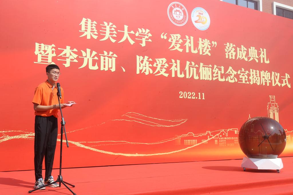 留学生代表、来自马来西亚的2019级留学生柯毓唐发言,作为一名陈嘉庚奖学金学生,李氏基金的捐赠为他创造了更国际化的学习和生活条件,他决心努力学习专业知识,成为一名传播嘉庚故事和中华文化的使者。