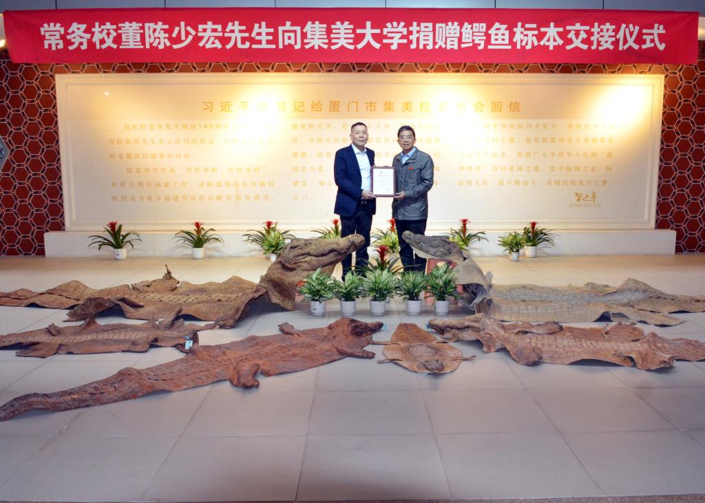 11月30日下午,我校常务校董、中国侨商会副会长、加拿大集美校友会会长、集美区侨联名誉主席、南顺投资董事长陈少宏先生再次向我校捐赠7件鳄鱼皮标本。陈少宏先生、校长李清彪,校党委宣传部、国际合作交流处、水产学院、自然科学馆等相关单位负责人出席交接仪式。