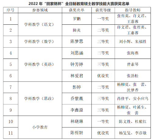 近日,由“田家炳基金会”冠名、全国教育专业学位教育指导委员会指导主办的2022年“田家炳杯”全日制教育硕士专业学位研究生教学技能大赛决赛获奖名单陆续公布,我校在语文、数学、英语、思政学科教学及小学教育5个领域选派了24名教育硕士研究生参加大赛取得优异成绩。