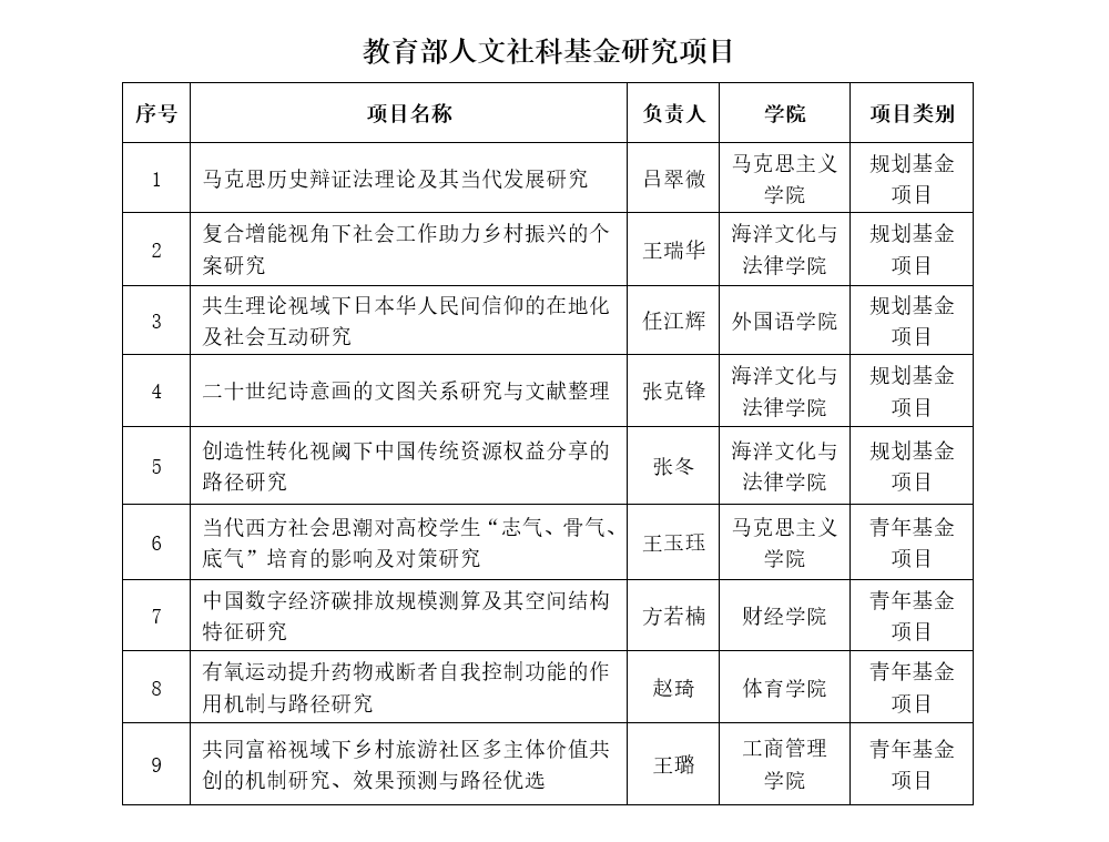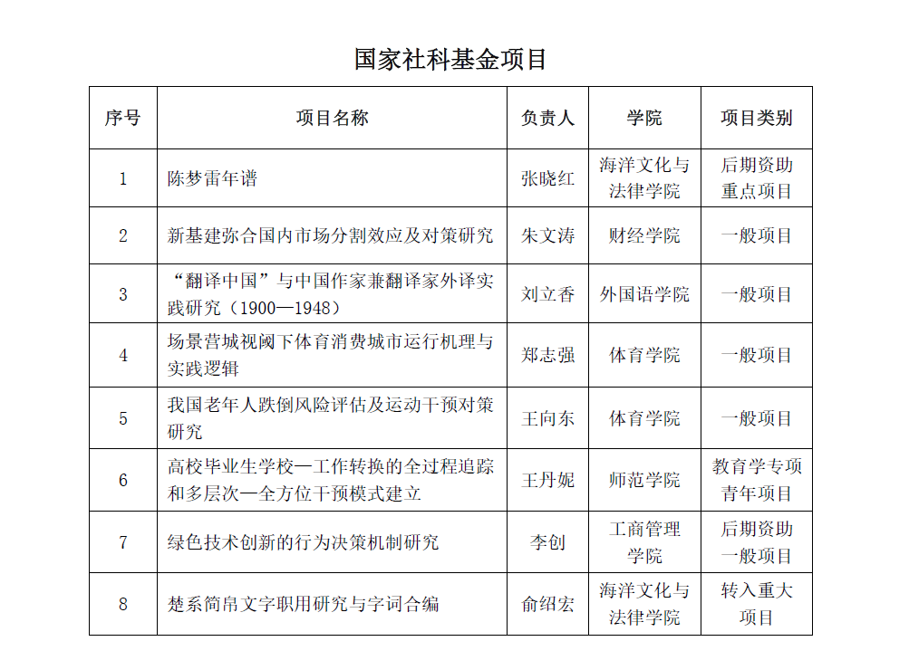 高层次研究项目立项成绩喜人。8个项目获批国家社科基金项目(含教育学单列、后期资助、转入1重大项目),连续3年实现国家级重点项目立项;9个项目获批教育部人文社科基金研究项目,创学校近十年新高,立项数居福建省第3位、全国第106位,规划项目命中率达23.8%。此外,我校不断拓宽人文社科项目研究申报渠道,2个全国高校古籍整理研究项目获批。