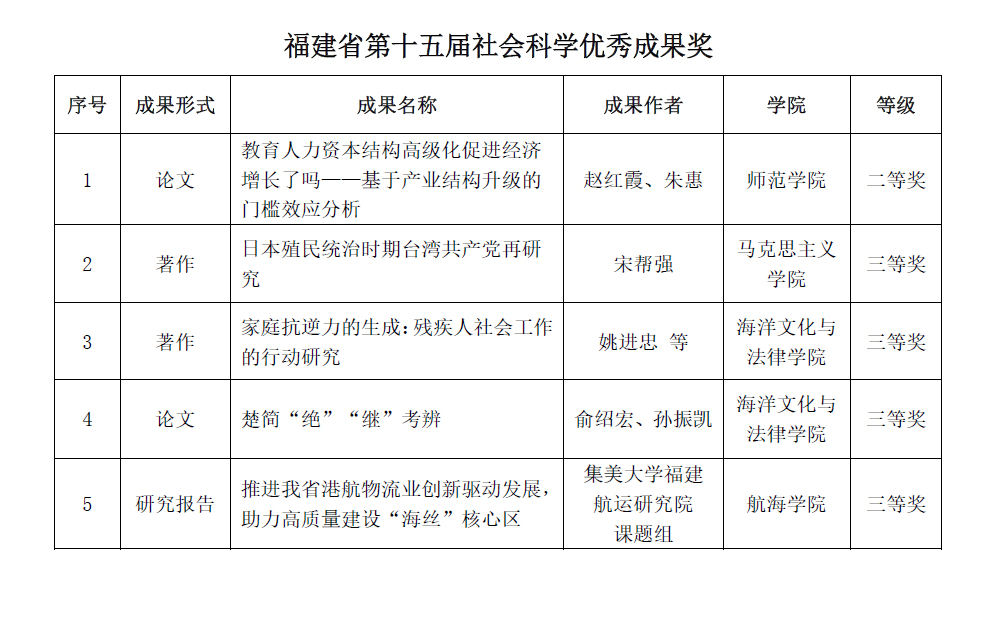 优秀成果产出成绩显著。5个项目获福建省第十五届社会科学优秀成果奖(其中二等奖1个,三等奖4);7个项目申报第九届高等学校科学研究优秀成果奖(人文社会科学)全部通过初审。