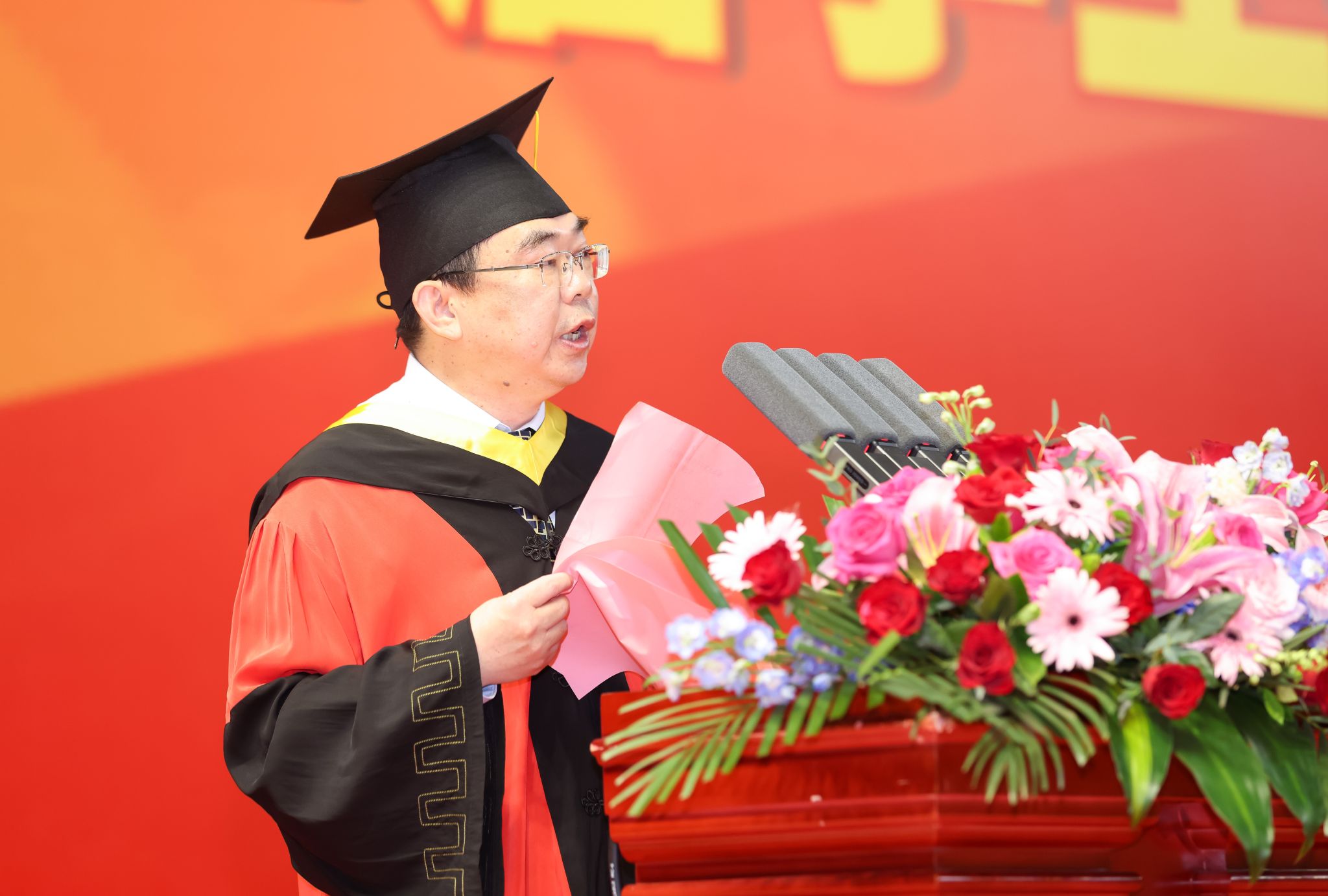 校党委副书记、校长谢潮添以“做更好的自己”为题深情寄语毕业生。他回顾了2024届全体毕业生“与集大共成长”留下的专属“集大记忆”,勉励全体毕业生:一要以“诚”为本,做真实的自己。增强自我认知,发掘和提升潜能,在真实世界中交互和成长,成就精彩人生。二要以“毅”立身,做勇敢的自己。不惧险、不畏难,坚定信心,扛起重担,用愿担当的自觉、敢担当的动力、善担当的本领,迎接人生挑战,为自己、为家国争取荣光。三要追求卓越,做更好的自己。要确立目标、认准方向,坚定信念、奋力拼搏,坚韧不拔、持之以恒,勇闯每一个艰难险滩,迎接每一次惊涛骇浪,不断追求卓越,不断做更好的自己。