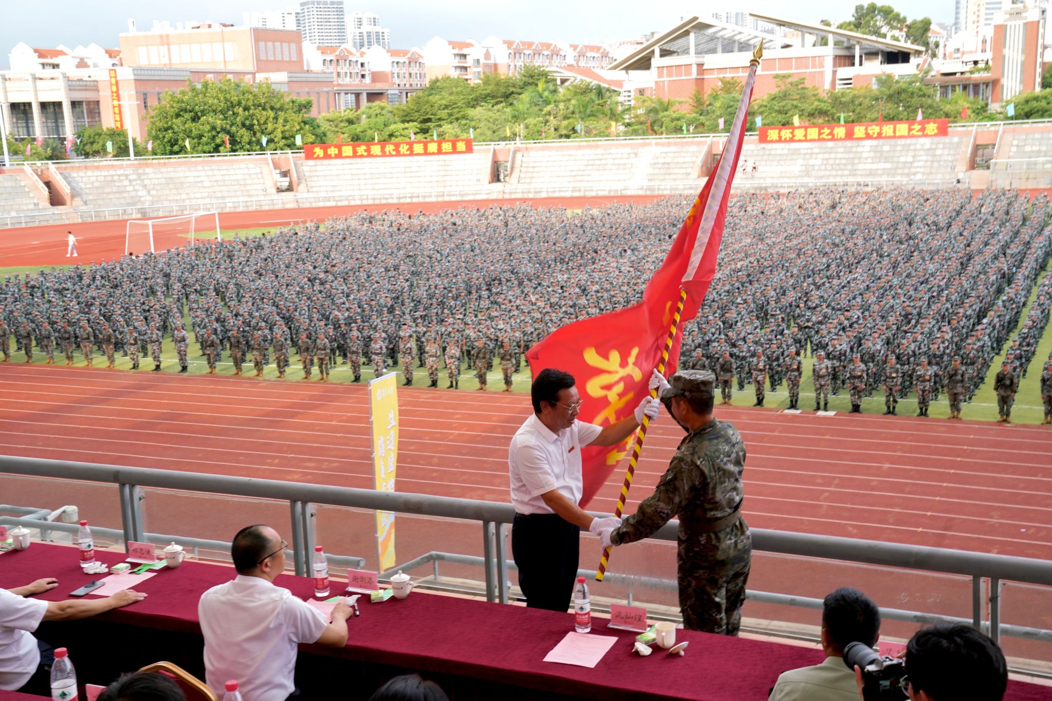 校党委副书记、校长谢潮添致辞。他代表学校党政领导和全体师生员工对2024级新同学的到来表示欢迎,向此次承训部队的首长和教官们表示感谢。他希望同学们做一个有情怀的人,涵养深沉的家国情怀,赓续嘉庚精神,积极行动起来,用心去感知世界的美好,用自己的方式去传递正能量;做一个会学习的人,要按照“诚毅”校训获取深度自主学习的能力以及独立思考和判断的智慧,让强大的人工智能由我主导、为我所用,并由此去改造世界、实现人生的价值;做一个能解决问题的人,要面对现实、直面问题,投身火热的实践中锤炼强大思维和干事创业能力,以坚决有效的执行力解决一个个问题。