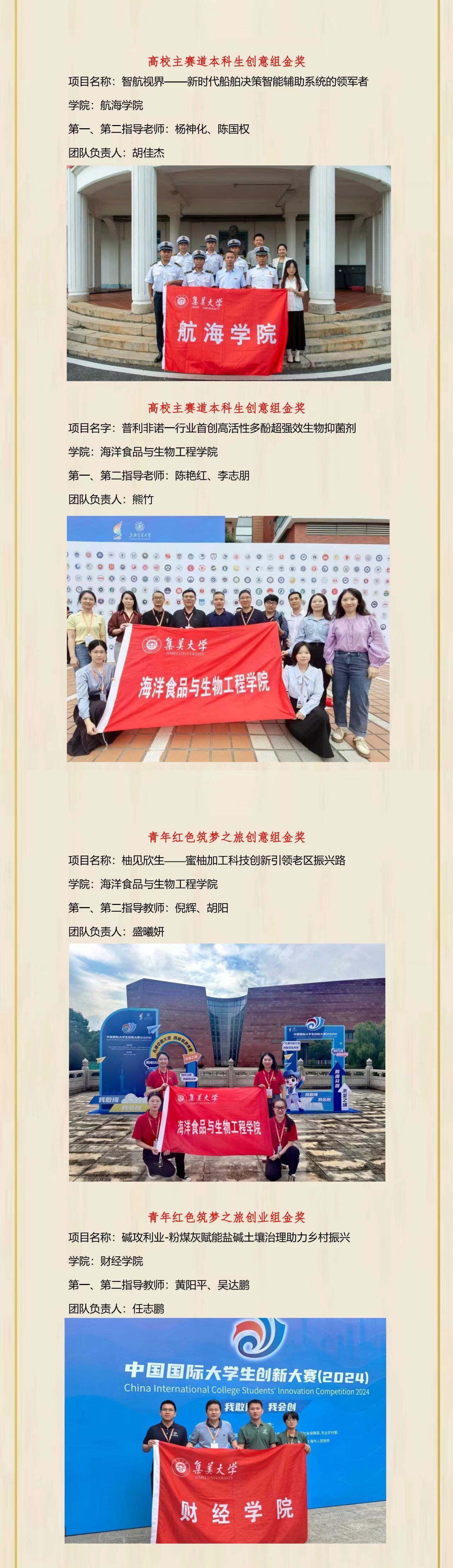 10月12日至15日,中国国际大学生创新大赛(2024)总决赛现场赛及同期活动在上海交通大学举行。经激烈角逐,我校勇夺金奖4项、银奖2项、铜奖5项。金奖总数位列全国高校第15位、福建省第2位,夺金数创历届学校参赛以来新高。