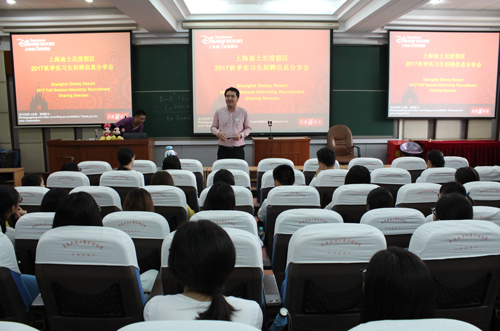 10月18日,工商管理学院举行上海迪士尼度假区2017秋季实习生招聘信息分享会,正式启动学院与上海迪士尼公司合作实习项目。上海迪士尼度假区校园关系经理徐麟、校园关系主任褚怡旻等来学院进行宣介和面试。