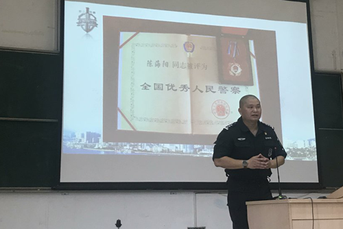 报告中,陈海阳以“家门  校门  警门”为题,分享了自己家庭教育、学校培养以及工作经历;讲述了自己从警21年来,凭着对党的忠诚和对人民群众的爱,保一方平安,在平凡的岗位上书写了不平凡的成长经历。他以自身的经历勉励同学们,在校要好好掌握专业知识,多参加社团活动,丰富自己的阅历,为走上社会打下坚实的基础。