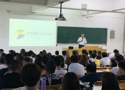 9月18日下午,海外教育学院党委书记徐德辉为2019级新生讲授“如何适应大学生活”。