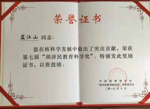 近日,第七届“胡济民教育科学奖”评选结果揭晓,我校理学院16级应用物理学毕业生党员蓝江山,以(唯一)在读研究生身份获此殊荣,并受邀在第十七届全国核物理大会暨十三次会员代表大会上作报告。