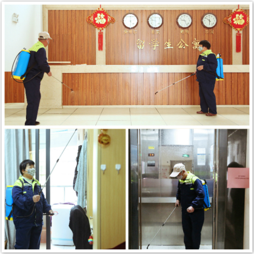在物业管理部门的认真配合下,学院此次对学院办公楼、留学生公寓的公共区域和电梯间进行全面消毒,并重点对寒假期间留校的留学生居住房间进行消毒,为新学期即将返校的师生营造一个温馨安全的学习生活环境。