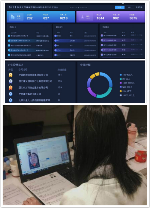 双选会共收到毕业生投递简历3675份,其中中国铁建港航局集团收到了154份,建发国旅收到了116份,万科物业收到了109份。用人单位和毕业生信息沟通热烈,空中视频面试流畅。