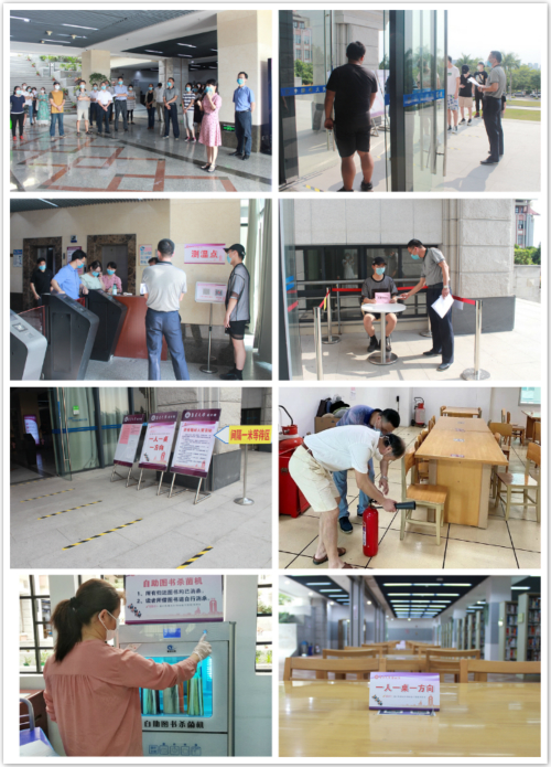 图书馆还积极做好学生返校复学后正式开馆的其他各项准备工作。图书馆成立了图书馆疫情防控工作领导小组,多次召开防控工作专题会议进行传达、研究和部署,制定了一系列防疫与开馆工作方案和预案;积极开展消防设施等安全检查、场馆清洁消毒、借还图书杀菌处理、阅览座位布局调整、内务整理以及防疫标识设置等工作。为确保正式开馆后学生读者入馆工作有序、可控,图书馆技术人员加班加点开发了入馆预约系统。