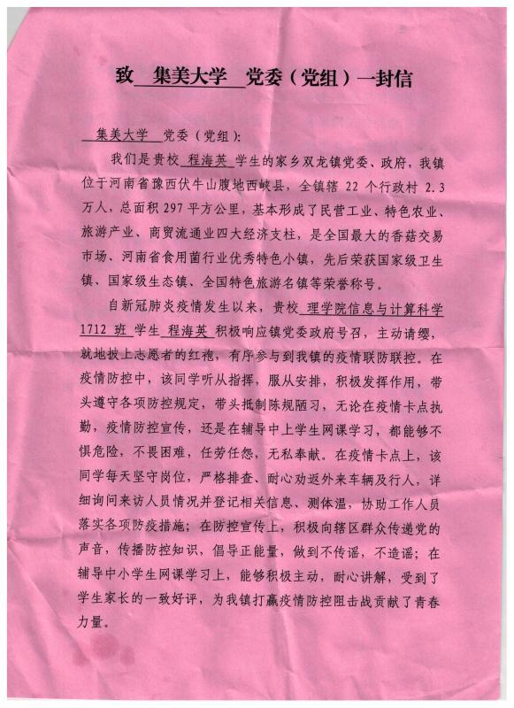 在疫情防控期间,程海英同学积极参与疫情卡点执勤、疫情防控宣传、辅导中小学生网课学习等工作,受到学生家长的一致好评。信中对程海英同学在疫情防控中的积极表现给予充分肯定,并对学校、学院的发展表达诚挚的祝福。