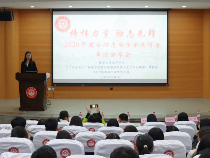 12月18日晚,由水产学院、校学生工作部《“三全育人”视域下高校发展型资助育人工作体系构建》课题组联合主办,水产学院团委及2019级本科生学生党支部承办的“榜样力量 励志先锋”国家励志奖学金获得者事迹分享会在水产综合楼一楼报告厅举行。水产学院党委副书记黄庆胜、校学生处资助管理办公室主任黄珊珊、学院团委书记张艳娇、全体辅导员及全院国家助学金获得者近二百人参加分享会。