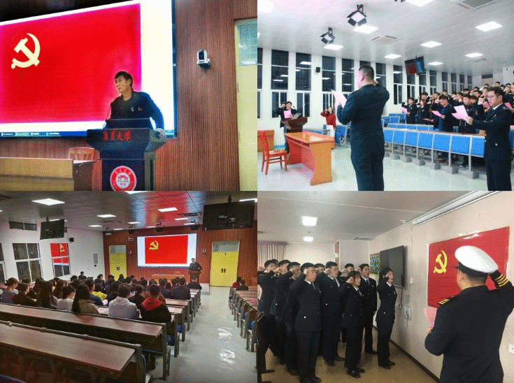 近日,航海学院在院内和育德轮上举行新党员入党宣誓仪式。学院党委副书记曹兆平、全体政工干部、57名新党员参加了学院的宣誓仪式;育德轮政委余金贤、带队老师梅强和8名新党员、9名正式党员参加了育德轮上的宣誓仪式。