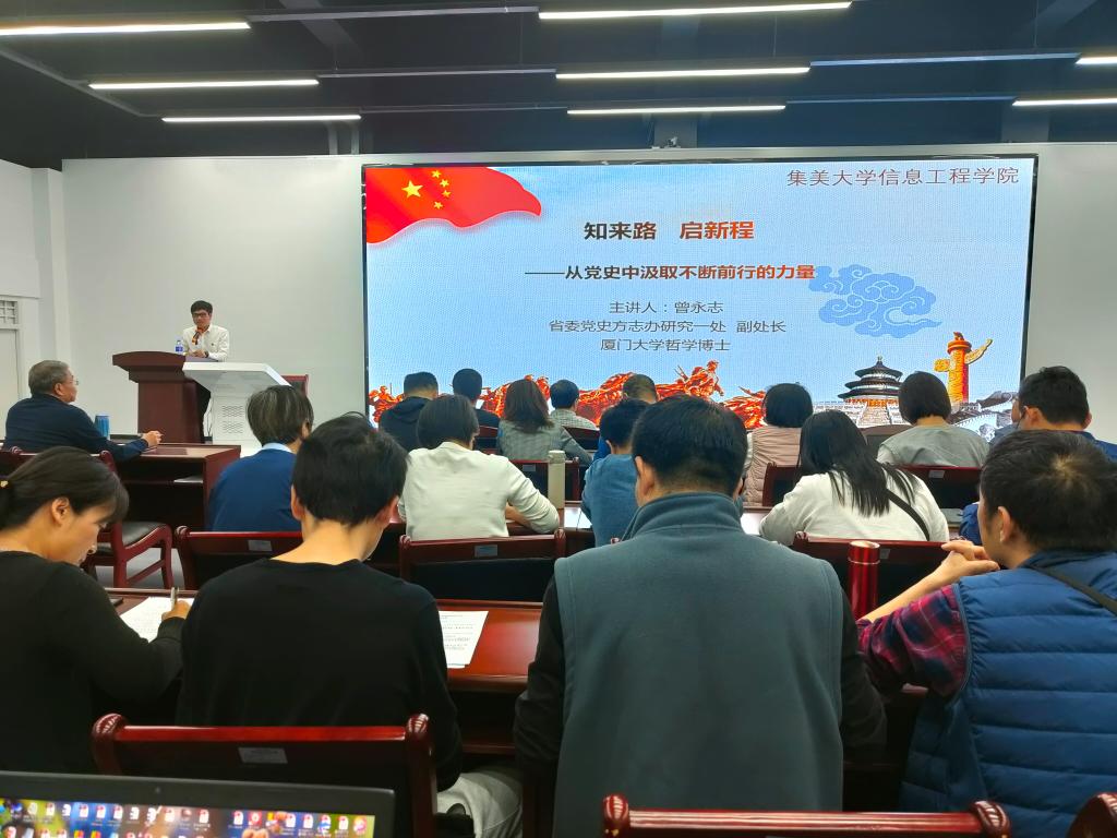 近日,信息工程学院邀请福建省委党史方志办研究一处副处长、厦门大学哲学博士曾永志为信息工程学院全体教工和学生党员作题为《知来路 启新程——从党史中汲取不断前行的力量》的专题讲座。讲座由学院党委副书记于宏鹏主持。