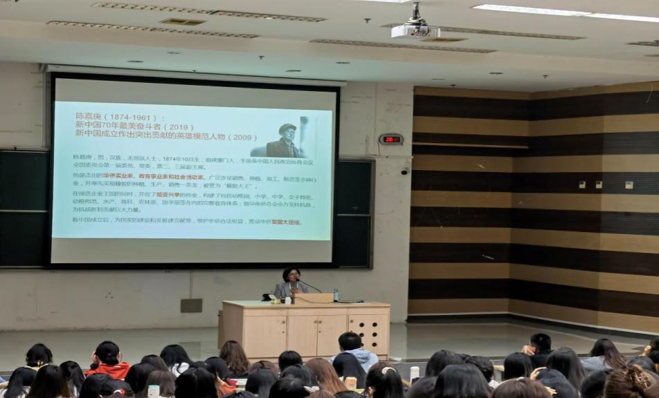 戴美玲从开展党史学习教育的背景和总体要求引入,为同学们介绍陈嘉庚先生和中国共产党从相识相交到同向同行、肝胆相照的历史过程与意义。从“求”“悟”“信”“行”四个方面讲述了在救亡图存时代里,陈嘉庚先生在革命救国、教育救国的艰辛探索过程中,积极参与建设新中国的历史的过程。戴美玲强调陈嘉庚和中国共产党交集的历史体现了中国共产党同党外人士的团结奋斗、风雨同舟的光辉历程。同时也深刻阐述了嘉庚精神与中国共产党是以爱国主义为核心的民族精神和以改革创新为核心的时代精神二者的集中体现。