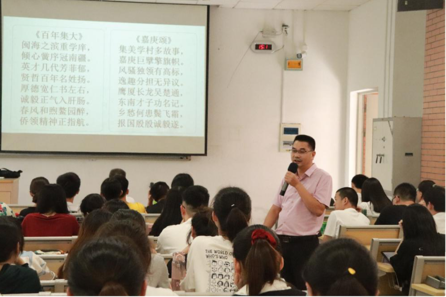 讲座中,洪金坚根据自己多年的学习和教学经验,分享了许多宝贵的知识。同时将数学与我国博大精深的文化相结合, 分析当今数学学习现状,讲解了如何激发培养学生学习数学的兴趣。其次,洪金坚还教授同学们打造诗意趣味课堂的七类方式,用“数中有文、文中有理”巧妙地将语文文化与数学逻辑思维联系在一起,使抽象的数学逻辑更加诗情画意地表达出来。讲座内容更是加入了许多押韵的口诀,激发同学积极参与,举手朗读。通过洪金坚老师深入浅出的讲解,学院师范生对于如何打造一堂生动的数学课堂有了全新的认识,更增强了对于未来教育事业的热爱。讲座最后,洪金坚老师鼓励同学们要传承“诚毅”品格,争当合格的“四有”好老师。