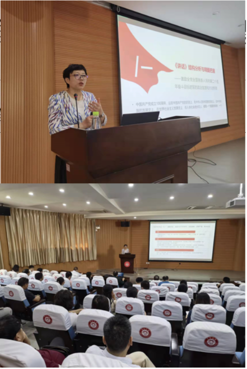 李晋玲按总论、分论、结论三个层次,对习近平总书记“七一”重要讲话精神进行分析归纳;运用生动的图片、视频材料,结合丰富的党史事例,对“四个伟大成就”“四个庄严宣告”“九个必须”“中国共产党人的精神谱系”等讲话要点深入阐述,帮助在场师生进一步领悟理解“中国共产党为什么能”“马克思主义为什么行”“中国特色社会主义为什么好”, 以及如何把建党精神融入到学习、工作、生活中,积极进取,同甘共苦,为实现中华民族伟大复兴努力奋斗。