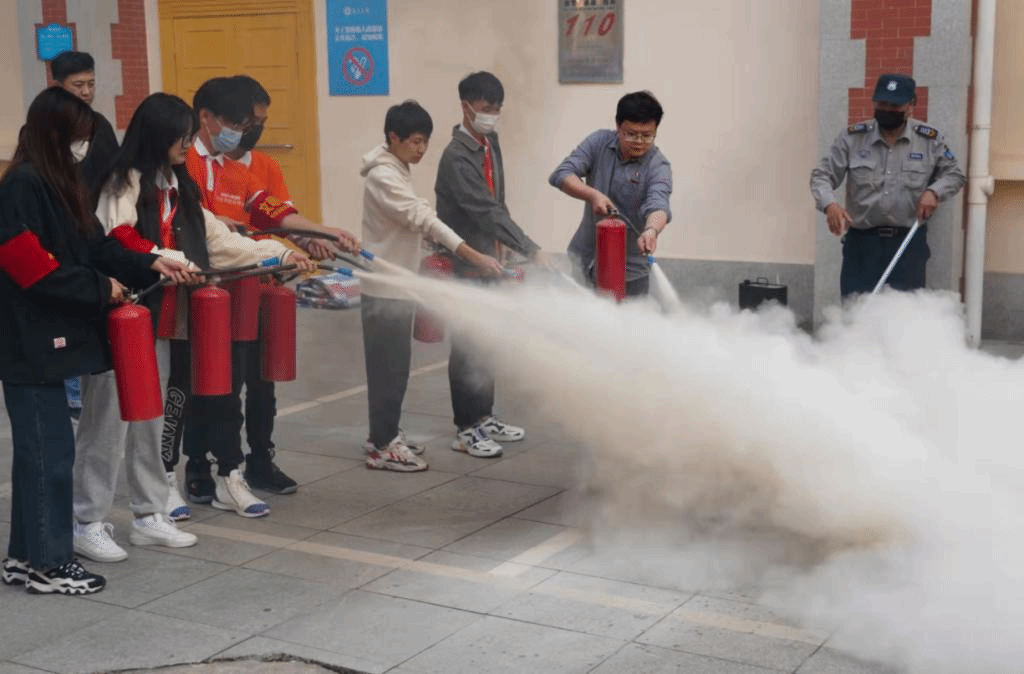 随着哨声响起,消防安全应急疏散演练正式开始,负责维持楼梯和操场秩序的负责人迅速到位,确保疏散安全。同学们在现场工作人员的组织下,按照事先设定的疏散路线快速、有序地进行撤离。随后,2021级全体学生参加灭火演练。活动现场,校保卫处负责老师向同学们讲解消防安全应急操作和火场逃生技巧,各班同学在工作人员的指导下使用灭火器进行实战演习。
