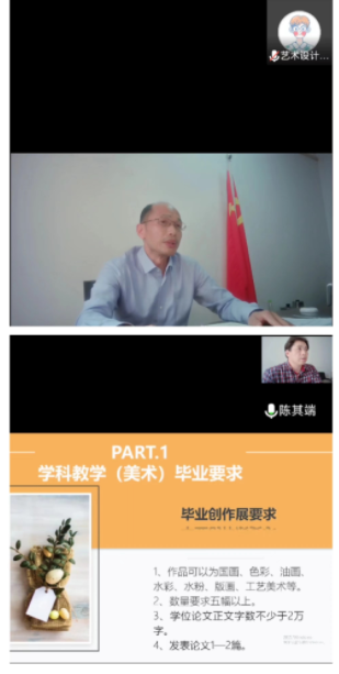 会上,党委书记陈延童强调了目前疫情防控的严峻形势、要求全体研究生提高政治站位,主动配合学校做好疫情防控工作,鼓励研究生积极与校内外导师沟通,参加各类课题和竞赛,不断提升自己的学术水平。院长陈其端分别对学科教学(美术)、设计学(学硕)、艺术设计(专硕)三个专业关于毕业展览、毕业论文、学术论文发表、奖学金评定等方面的要求进行讲解。党委副书记欧阳艺强调全体研究生要积极配合学校展开一日三测、核酸检测等疫情防控工作。副院长汪晓东解答了关于学生毕业论文、毕业作品展览等方面的具体问题。